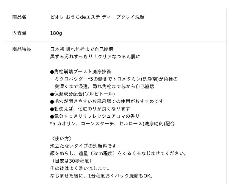 『ビオレ おうちdeエステ ディープクレイ洗顔』は、"隠れ角栓まで自己崩壊"、黒ずみ汚れまですっきり、クリアなつるん肌に導く洗顔料です。花王独自の角栓崩壊洗浄技術が進化した、日本初*2となる"隠れ角栓まで自己崩壊"させる、角栓崩壊ブースト洗浄技術を採用。トロメタミン(洗浄成分)が毛穴の角栓をほぐし、新配合のミクロパウダー*6が、ほぐれた角栓を吸着し、毛穴の外に排出させることで、さらにトロメタミンが角栓の奥深くまで作用します。これにより、隠れ角栓まで自己崩壊させます。