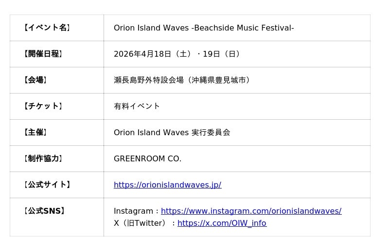 オリオンビール株式会社(本社:沖縄県豊見城市、代表取締役社長 兼 執行役員社長CEO 村野 一)は、リゾーツ琉球株式会社、株式会社イープラス、日本トランスオーシャン航空株式会社とともに設立した「Orion Island Waves 実行委員会」のもと、GREENROOMの制作協力により開催するビーチサイド音楽フェス「Orion Island Waves -Beachside Music Festival-」を開催いたします。このたび、両日のタイムテーブルを発表いたします。