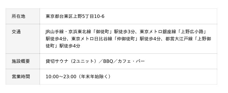 「HUBHUB」は三井不動産グループのShareTomorrowが手掛ける移動式ユニットを活用した遊休不動産の有効活用事業で、「HUBHUB御徒町」はこれまで活用されていなかったJR山手線の鉄道高架下を新たに利活用した、サウナ×BBQ×カフェ・バーの「情報発信空間」です。2種類のサウナは、それぞれ最大5名で貸切利用可能で、セルフロウリュできるフィンランドサウナ・水風呂・外気浴スペースを備えています。通常時カフェ・バーとして営業しているユニットは、貸切パーティー等での使用も可能です。