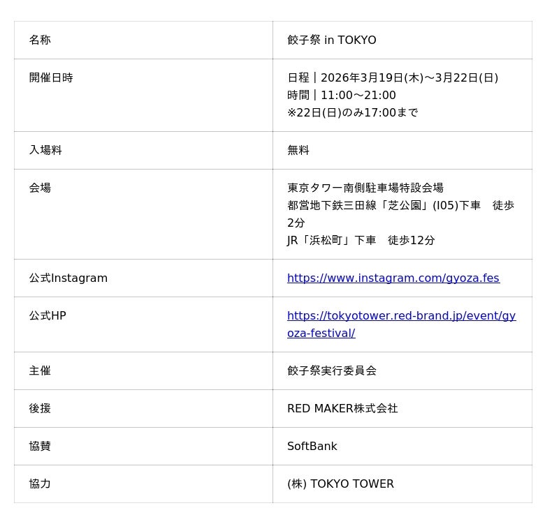 FoodFes株式会社(代表取締役:稲垣一馬)は2026年3月19日(木)~3月22日(日)の4日間、「餃子祭 in TOKYO」を東京タワー南側駐車場特設会場(東京都港区)にて開催いたします。