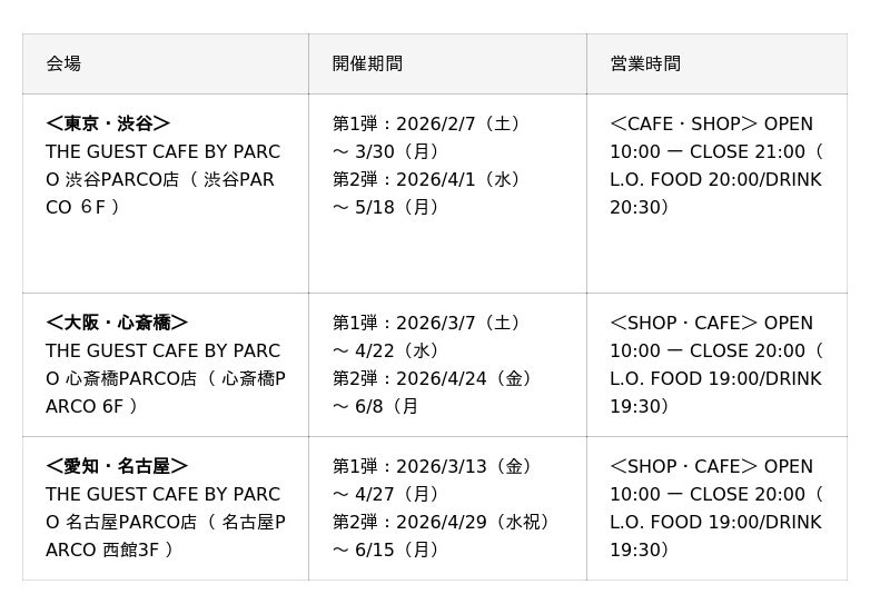 3月7日(土)より大阪・心斎橋会場、3月13日(金)より愛知・名古屋会場がいよいよスタートいたします。開催中の東京・渋谷会場では第2弾メニューが、4月1日(水)より提供開始となります。