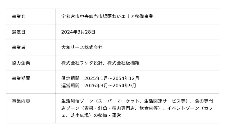 2022年11月、宇都宮市は、中央卸売市場の活性化と多様化する消費者ニーズへの対応を目的に「宇都宮市中央卸売市場賑わいエリア整備方針」を策定。2023年7月、老朽化した市場施設の一部を解体した跡地(約2.7ha)を活用して商業施設や交流拠点などを整備する民間事業者を公募しました。