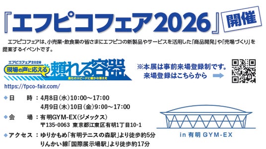 簡易食品容器の最大手である株式会社エフピコ(本社:東京都新宿区、以下「エフピコ」)は、2026年4月8日(水)から10日(金)までの3日間、東京都江東区の「有明GYM-EX(ジメックス)」において、小売・飲食業界向けの展示会「エフピコフェア2026」を開催いたします。本年度は「現場の声に応える 頼れる容器」をメインテーマに掲げ、深刻化する人手不足や原材料高騰に直面する経営者や実務担当者へ向けて、エフピコが提供する具体的な経営課題解決策を提示します。