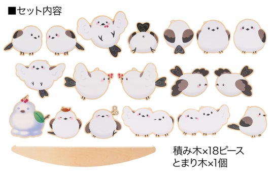 このセットには、18ピースのシマエナガ積み木が入っています。