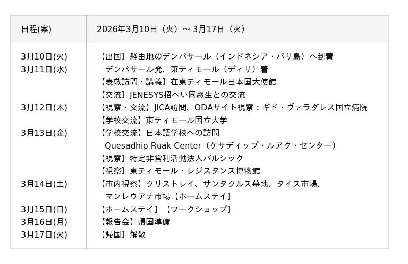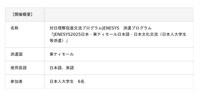 日本の大学生6名が「日本語・日本文化交流」をテーマに、JENESYS派遣プログラムの一環として東ティモールを訪問します。現地では、日本語や日本文化を紹介しながら学校交流を行い、参加者同士が互いの国への理解を深めます。