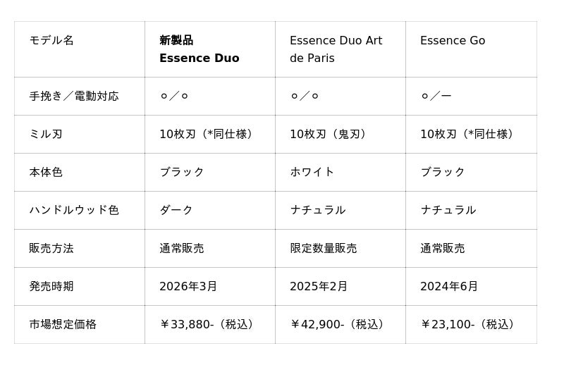 *モーターユニットは昨年2025年発売の限定数量モデル"Essence Duo Art de Paris"と同性能のものを採用しております。"Essence Duo Art de Paris"や"Essence Go"との主な違いは、下記の【Essenceシリーズの主な違い】をご覧ください。