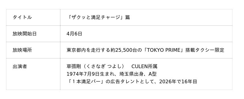 アサヒグループ食品株式会社(本社 東京、社長 川原浩)は、「1本満足バー」のタクシー広告「ザクッと満足チャージ」篇を4月6日から東京都内を走行する約25,500台の「TOKYO PRIME」搭載タクシーにて放映します。また都内限定で「1本満足バー」仕様のフルラッピングタクシー4台が3月9日から走行します。乗車の記念として草彅剛さんの乗車記念カードの配布を行います。