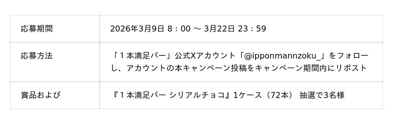 3月9日から1本満足バー公式Xアカウントにてキャンペーン投稿をフォロー&リポストした方の中から抽選で3名様に、『1本満足バー シリアルチョコ』1ケース(72本入り)をプレゼントします。