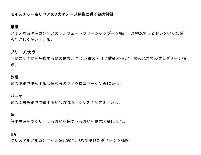 ※2:UV, 熱, 乾燥, パーマ, ブリーチ, カラー, 摩擦によるダメージ