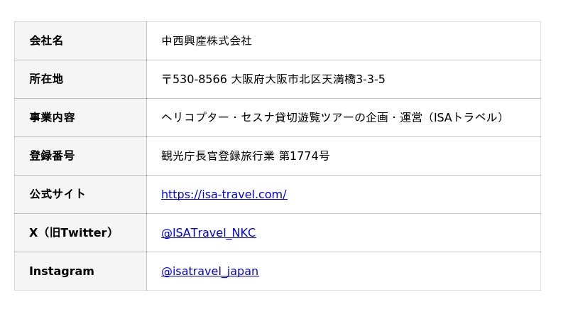ISAトラベルは中西興産株式会社が運営するヘリコプター・セスナ貸切遊覧ツアー専門サービスです。東京・横浜・大阪・京都・名古屋・沖縄・石垣島・淡路島など全国各地でツアーを展開。価格帯も15,000円未満のお手軽コースから50,000円以上のラグジュアリーコースまで幅広く取り揃え、記念日・誕生日・プロポーズ・インセンティブ旅行など多様なシーンに対応しています。■ 会社概要