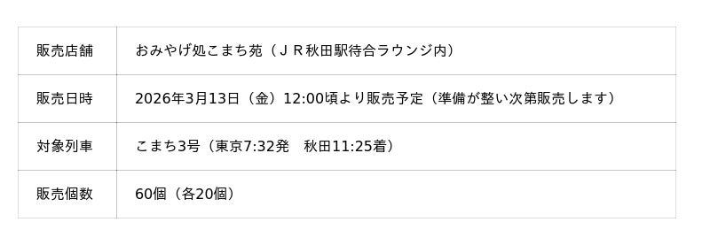 2026年3月13日(金)列車荷物輸送サービス「はこビュン」を活用し、JR秋田駅構内「おみやげ処こまち苑」にて数量限定販売!