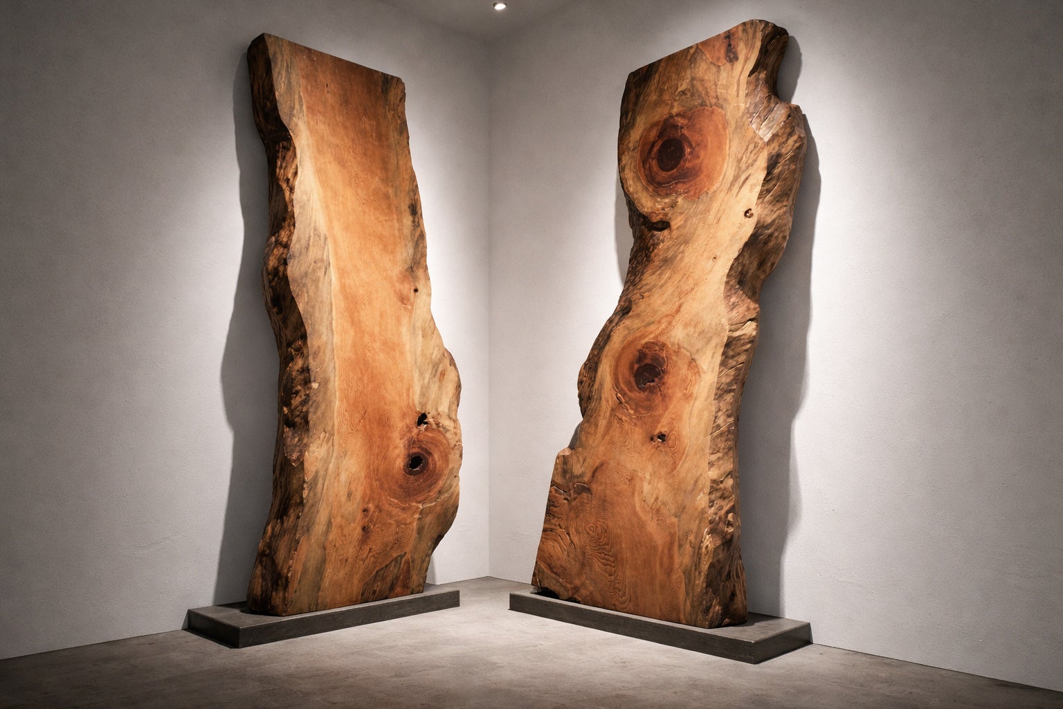 自然が刻んできた時間の痕跡を削り取るのではなく、そのまま受け止め、空間の中で静かに際立たせる。一枚板を単なる家具としてではなく、長い時間を生きてきた存在そのものとして提示する試みです。