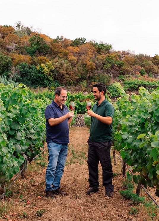 (写真左)ボデガス・ビニャティゴ創設者で、メンデス家4代目オーナー兼醸造責任者。テネリフェ島ラ・ラグーナ大学で化学および醸造学の学位を取得。カナリア諸島独自のブドウ栽培と科学的な知識を融合し、島固有品種を絶滅の危機から救ったことで世界的に高く評価されている。ワイナリーの経営に加え、長年にわたり醸造学の教育・研究活動を行っている。カナリア諸島原産地呼称保護委員会会長および、カナリア諸島ワイン生産者協会(AVIBO)会長を務める。