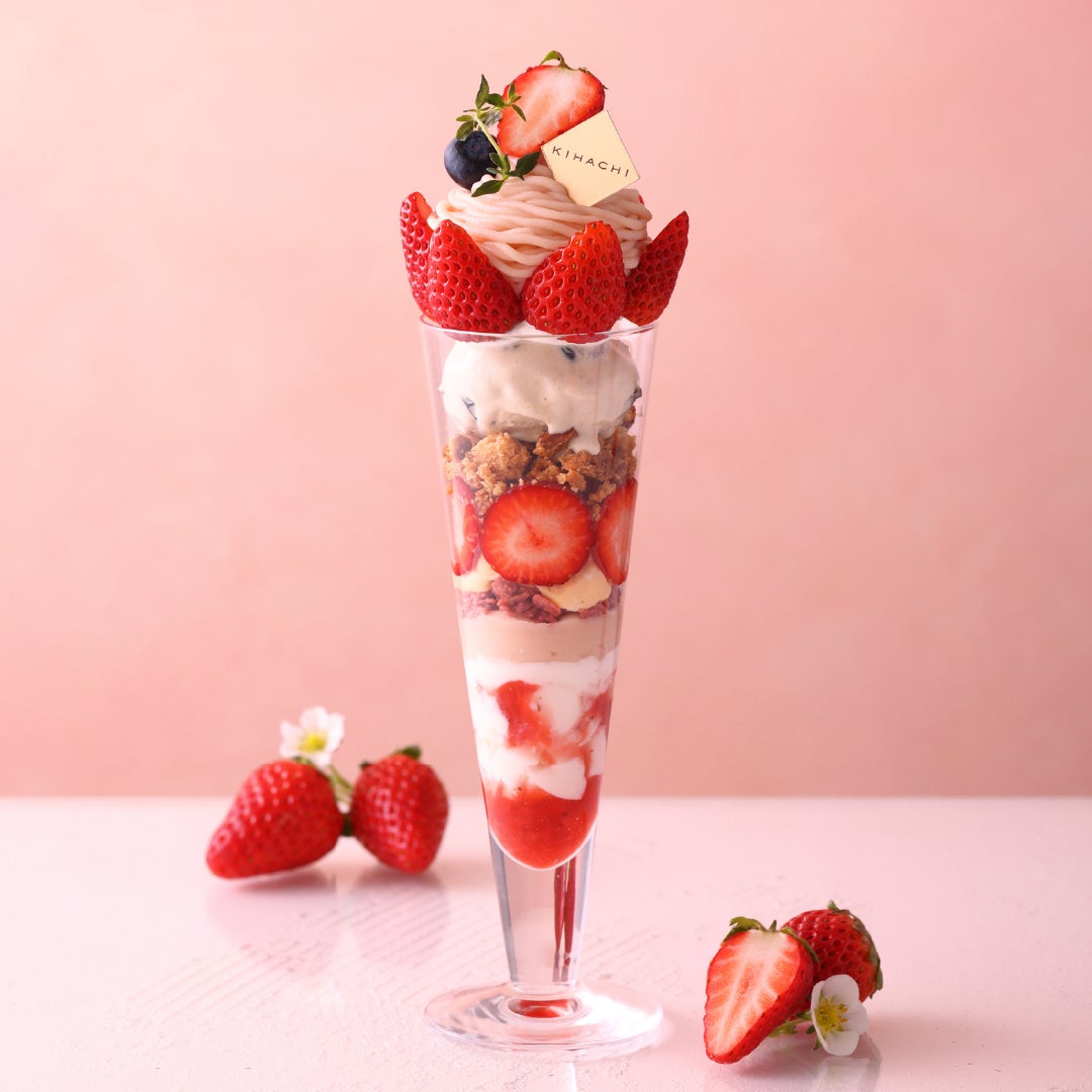 全店で楽しめる苺スイーツとして、シグネチャーの「KIHACHIのナポレオンパイ」、甘酸っぱい苺をメインに、マンゴー、パパイヤなど彩り豊かなフルーツを自家製クレープにあわせた「苺と彩り果実のクレープ アプリコットソース」、苺が引き立つシンプルな仕立ての「苺のショートケーキ バニラアイス添え」の3種が順次登場します。