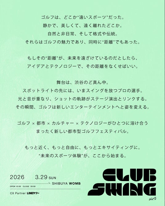「泡パ(R)︎」や「脳汁銭湯」「SAKURA CHILL BAR by 佐賀」など数々の話題作を生み出してきた体験クリエイティブカンパニー Afro&Co.(代表取締役CEO 山崎剛弘)は、同社が培ってきた体験設計のノウハウを結集し、ゴルフ事業の運営を手掛ける株式会社Always dream(代表取締役 江田達哉)と共同で、CLUB SWING実行委員会として、全く新しい都市型ゴルフフェスティバル「CLUB SWING VOL.0」を2026年3月29日(日)、渋谷WOMBにて開催いたします。本作は、格式高く静かなゴルフというスポーツを、音楽・ファッション・最新テクノロジーと融合させ、観客を当事者へと巻き込む"次世代ゴルフバトル・エンターテインメント"です。