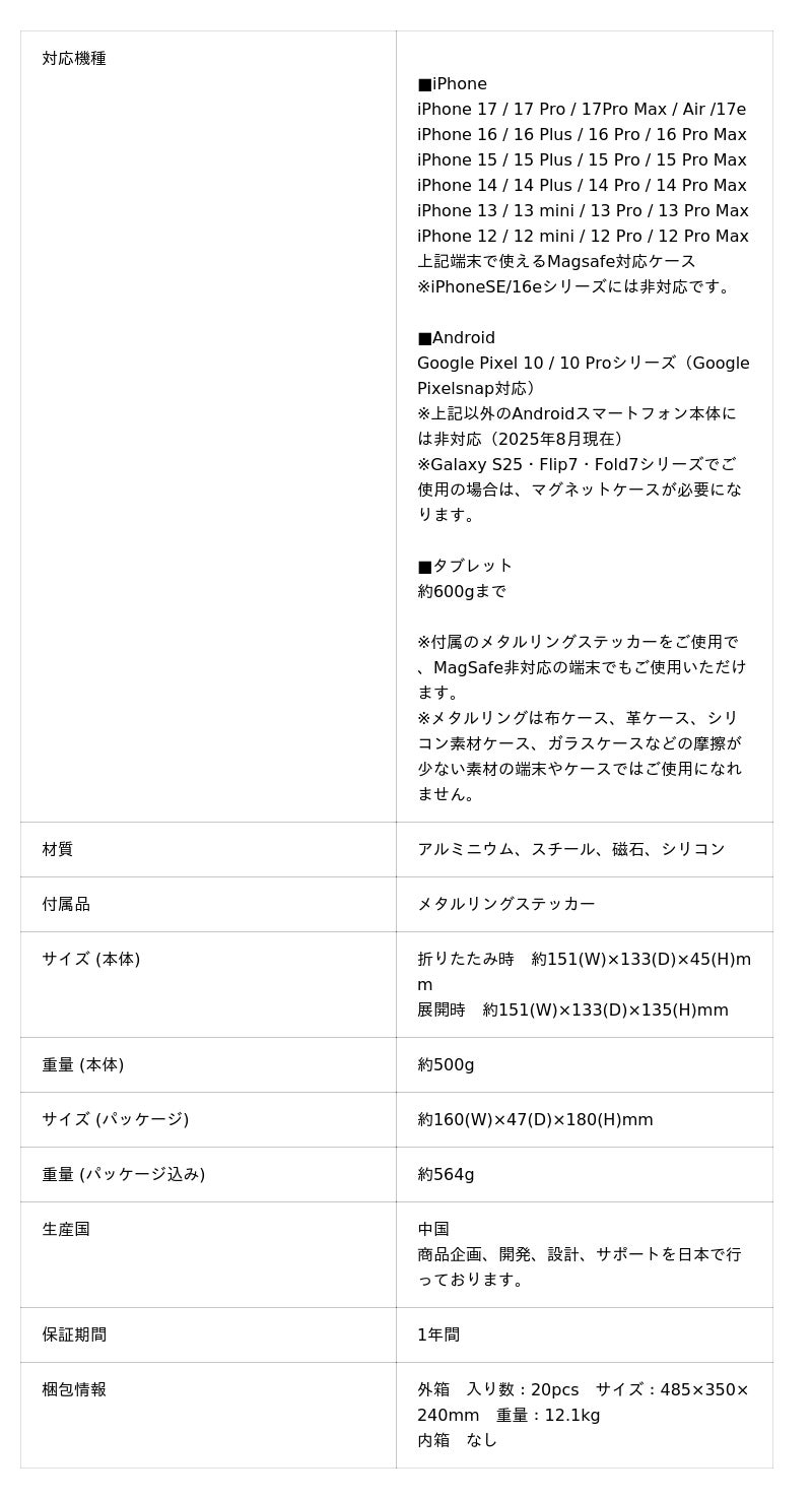 MagSafe対応iPhoneはそのまま、非対応のiPhone、Androidスマートフォン、iPadやタブレット、またゲームモニターやサブモニターなど、付属のメタルリングを使用することで、あらゆるシーンで使用ができます。※メタルリングを装着した状態ではワイヤレス充電はできませんので、ご了承ください。