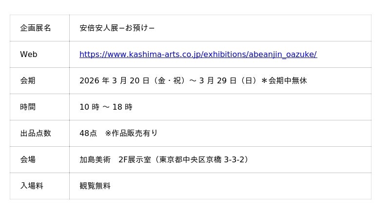 株式会社加島美術(東京・京橋)では、2026年3月20日(金・祝)から3月29日(日)まで、備前焼の鬼才・安倍安人による個展「安倍安人展-お預け-」を開催いたします。本展は、加島美術での四度目の安倍安人展となります。加島美術にて開催する安倍安人の個展では初出品となる《お預け徳利》をはじめ、新作を中心に48点をご紹介いたします。