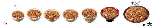ミニはごはんもお肉も少なめで気軽に食べやすいサイズ感!キングは並盛の約6倍のお肉、大盛の2倍のごはんの量でガッツリ食べたい方におすすめ!