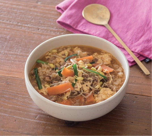 2.鍋にAを入れて中火にかける。沸騰したら豆もやしを加え、にんじんに火が通ったら牛丼の具とニラ、コチュジャンだれを加える。