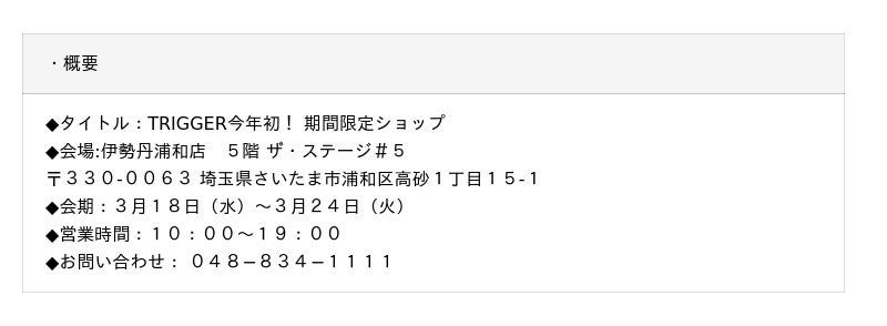 ※今回の販売及び展示アイテムに関しましては、一部POP-UP開催期間中はTRIGGER公式販売サイトでは販売はしておらず、イベント終了後に販売開始予定です。