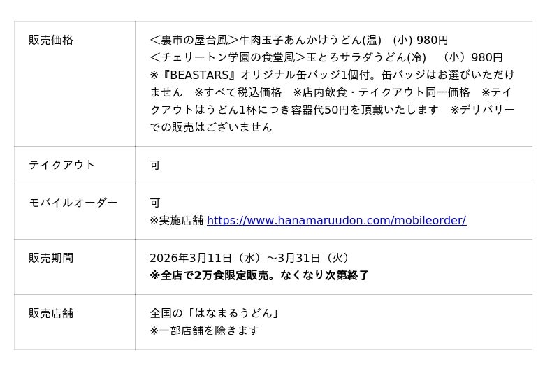 讃岐うどんチェーン「はなまるうどん」を展開する株式会社はなまる(本社:香川県高松市、代表取締役社長:前田良博)は、人気漫画『BEASTARS』のアニメ最終章となる『BEASTARS FINAL SEASON』Part2が2026年3月7日にNetflixにて独占配信されたことを記念し、期間限定のコラボレーション企画を実施いたします。