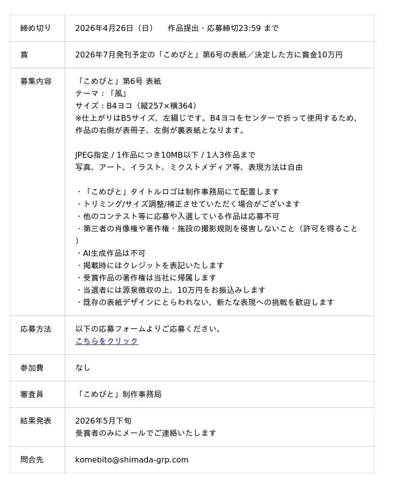 シマダグループ株式会社(本社:東京都渋谷区/代表取締役:島田成年)は自社で発行するブランド冊子「こめびと」の表紙を決定するデザインコンテストを開催いたします。