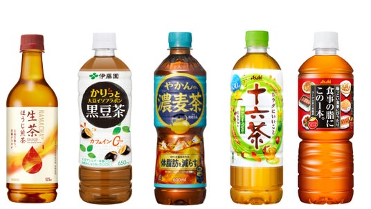 キリン 生茶ほうじ煎茶 525ml/伊藤園 黒豆茶 650ml/コカ・コーラ やかんの濃麦茶 600ml/アサヒ 十六茶 630ml /アサヒ 食事の脂にこの1本。 600ml