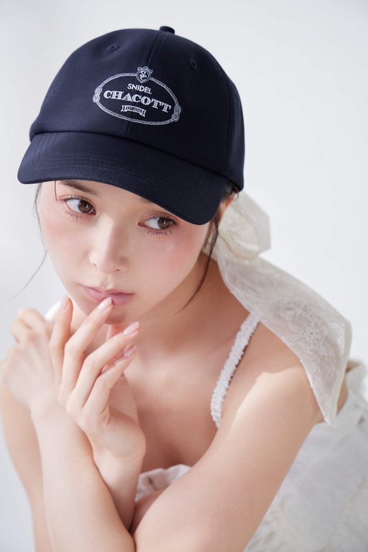 センターにChacottとSNIDELのオリジナルエンブレムを刺繍したキャップ。
