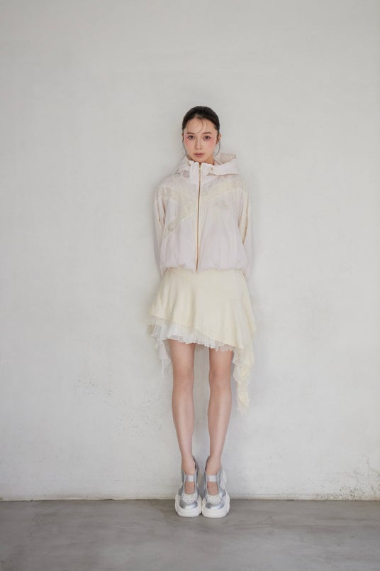 春夏らしい柔らかな色合いに、フロントや背中に贅沢にレースを散りばめたフード付きブルゾン。