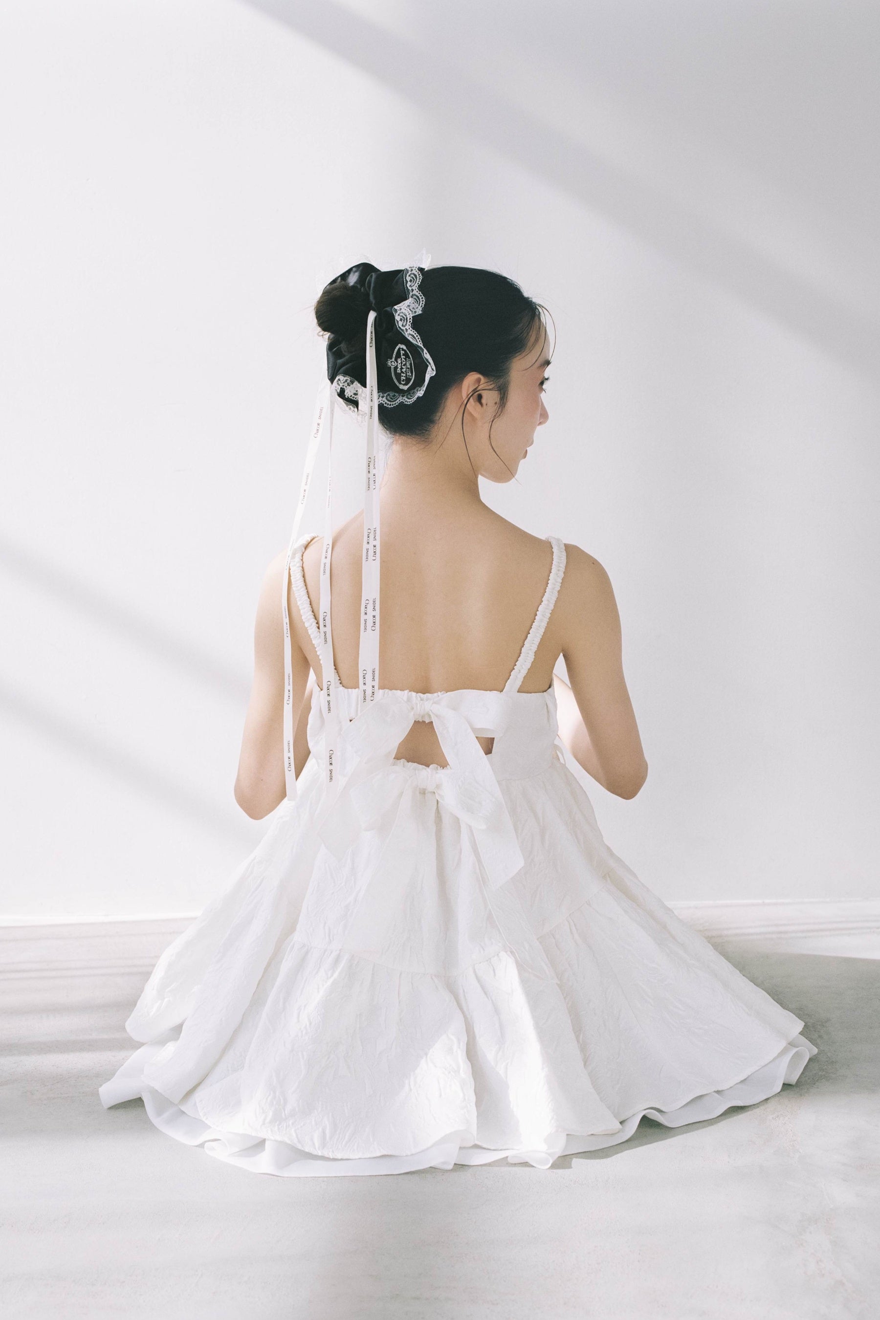 バックスタイルには長めのレースリボンをあしらい、トレンド感をプラスしました。