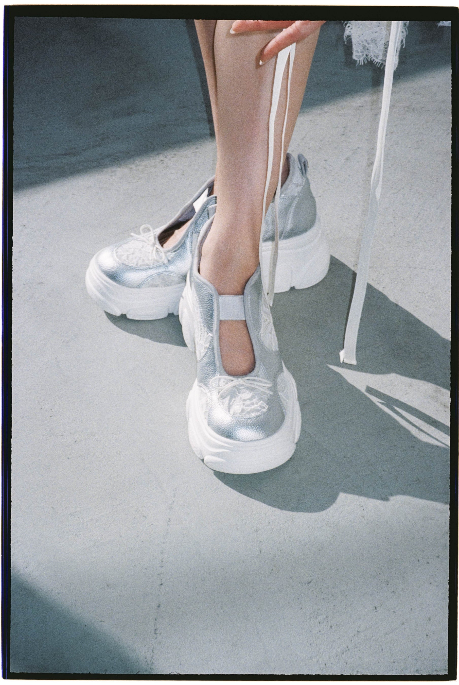 バレエシューズのようなガーリーな世界観を取り入れつつ、フェミニンでスポーティに仕上げた厚底スニーカー。