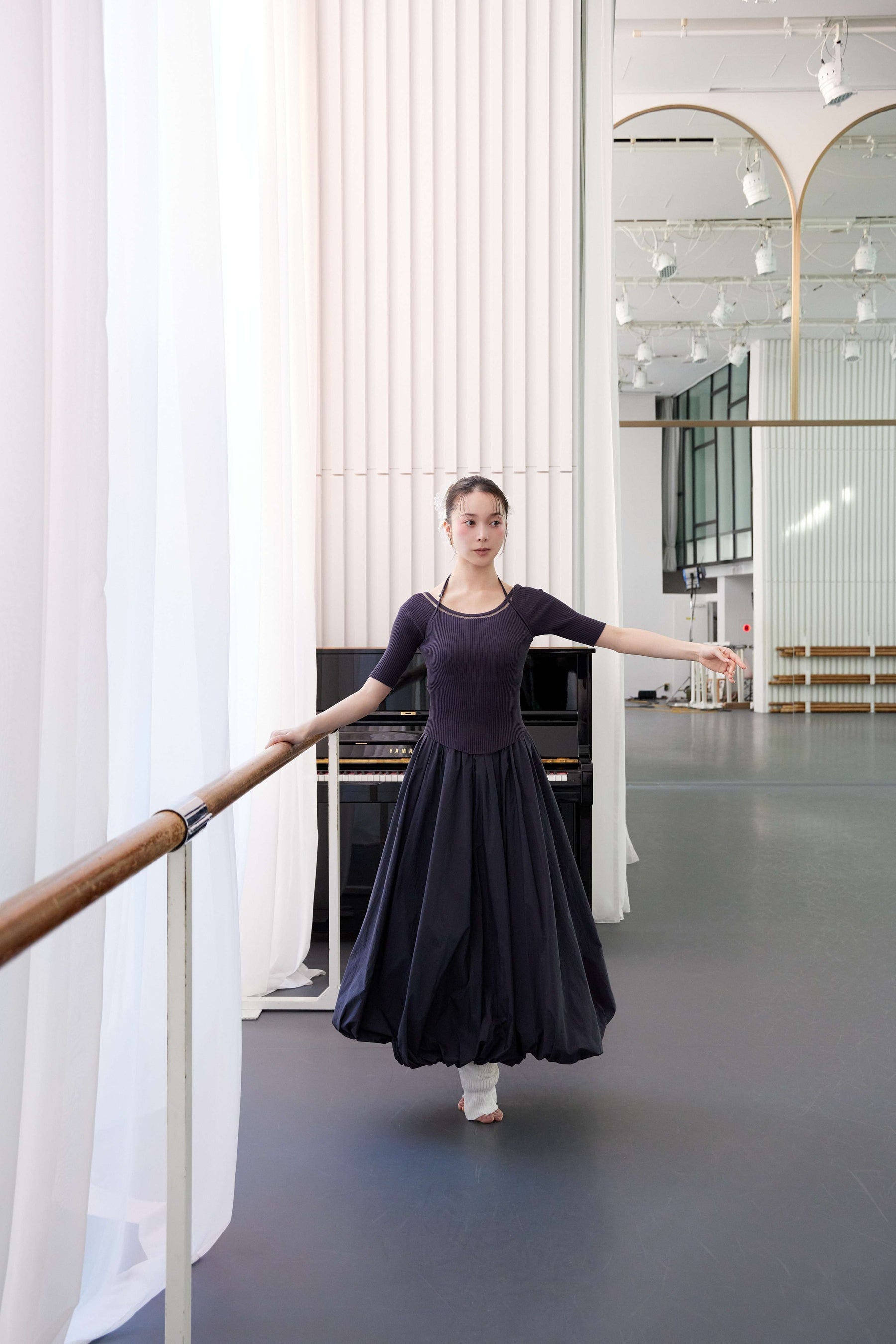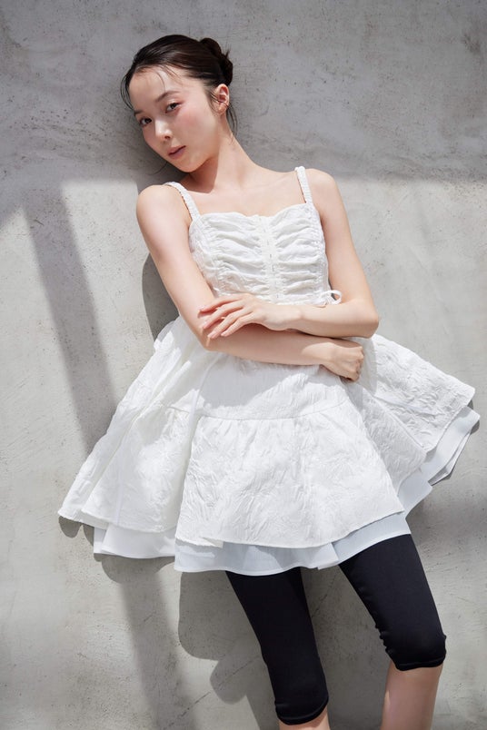 立体的で構築感のあるボリュームチュールスカートに、フリンジ感のある細やかなチュールフリルをたっぷりとあしらい、優雅で軽やかなバレエの世界観を表現。