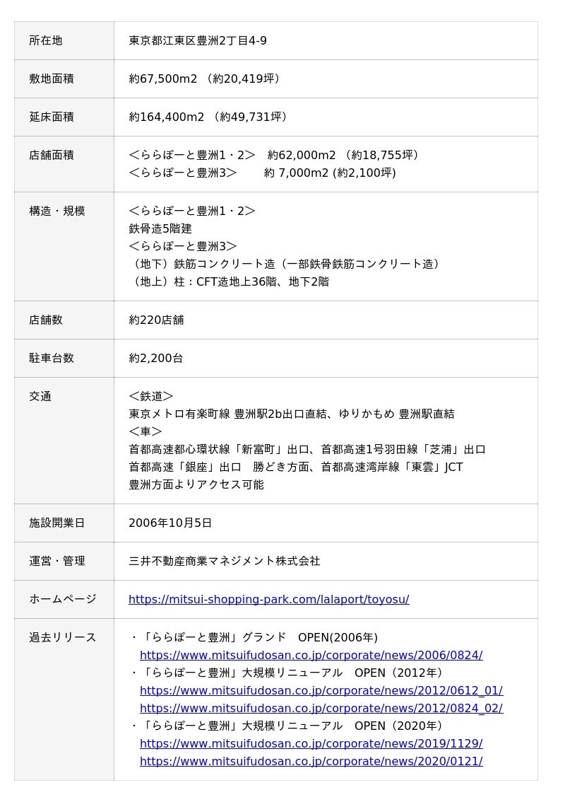 三井不動産株式会社(所在:東京都中央区、代表取締役社長:植田俊)は、2006年の開業以来、湾岸エリアでの生活を支える施設として成長してきた「三井ショッピングパーク アーバンドック ららぽーと豊洲」(所在:東京都江東区、以下「アーバンドック ららぽーと豊洲」)で大規模リニューアルを実施いたします。