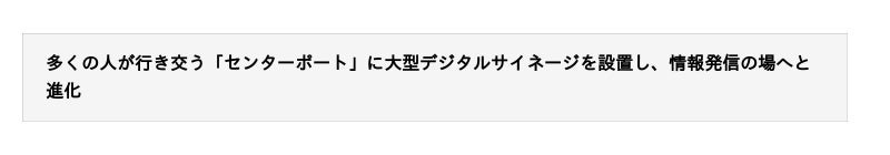 「センターポート」吹抜けエリアに、高さ4.5m×幅24mの大型デジタルサイネージを新設。イベントステージにて行われるイベントの中継や情報発信装置として機能し、視覚・聴覚に訴えかける環境演出を実装予定です。大型デジタルサイネージならではの没入感を生み出し、行き交う人が思わず立ち止まるスポットへと進化します。