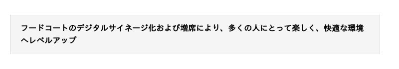 フードコート「マリーナキッチン」の柱面や壁面に合計27面のサイネージを設置し、「メディア」としての機能を搭載。「全面ジャック」の没入感を演出することが可能となるほか、パブリックビューイング会場としても機能する予定です。また、什器の刷新、増席を行うことで、より多くの人々に快適にご利用いただける空間へと生まれ変わります。