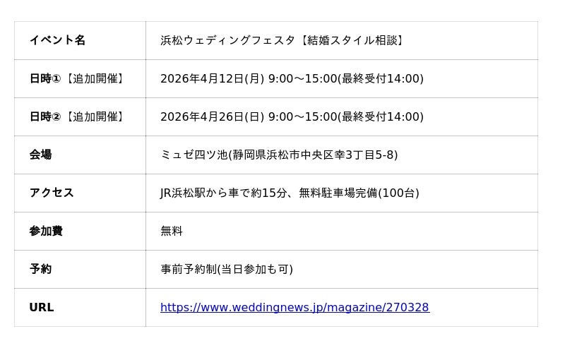静岡県浜松市でブライダル事業を行う株式会社スティルアン(本社:静岡県浜松市中央区田町326-30、代表取締役社長:大石 奉樹)は、ミュゼ四ツ池にて開催している体験型イベント「浜松ウェディングフェスタ」が好評につき、2026年4月12日(日)・4月26日(日)の追加開催を決定いたしました。