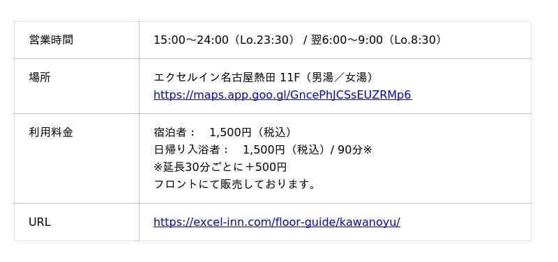 株式会社エクセルイン(愛知県名古屋市熱田区伝馬2丁目4番17号、代表取締役:苅谷治輝)が運営する「エクセルイン名古屋熱田」において、温冷浴のできる檜風呂、サウナの「川の湯」をオープンしました。宿泊者だけでなく、日帰り入浴の方もご利用いただけます。
