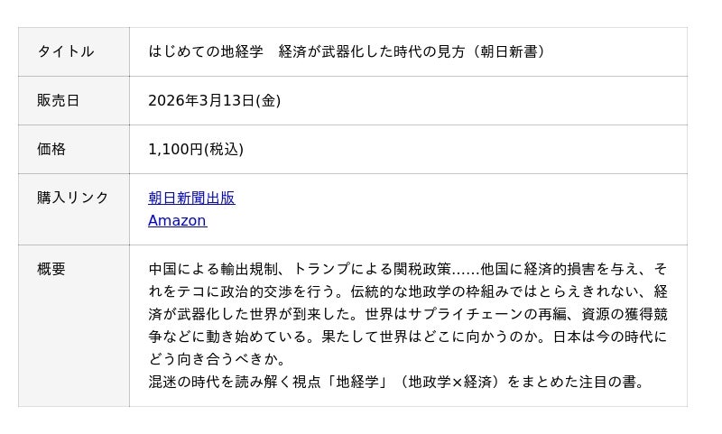 この度、国際文化会館 地経学研究所(東京都港区、理事長 近藤 正晃ジェームス、所長 鈴木一人、以下、地経学研究所)は、『はじめての地経学-経済が武器化した時代の見方-』(朝日新聞出版/朝日新書)を、2026年3月13日に刊行いたします。本書は全国の書店やオンラインサイトでご購入可能です。