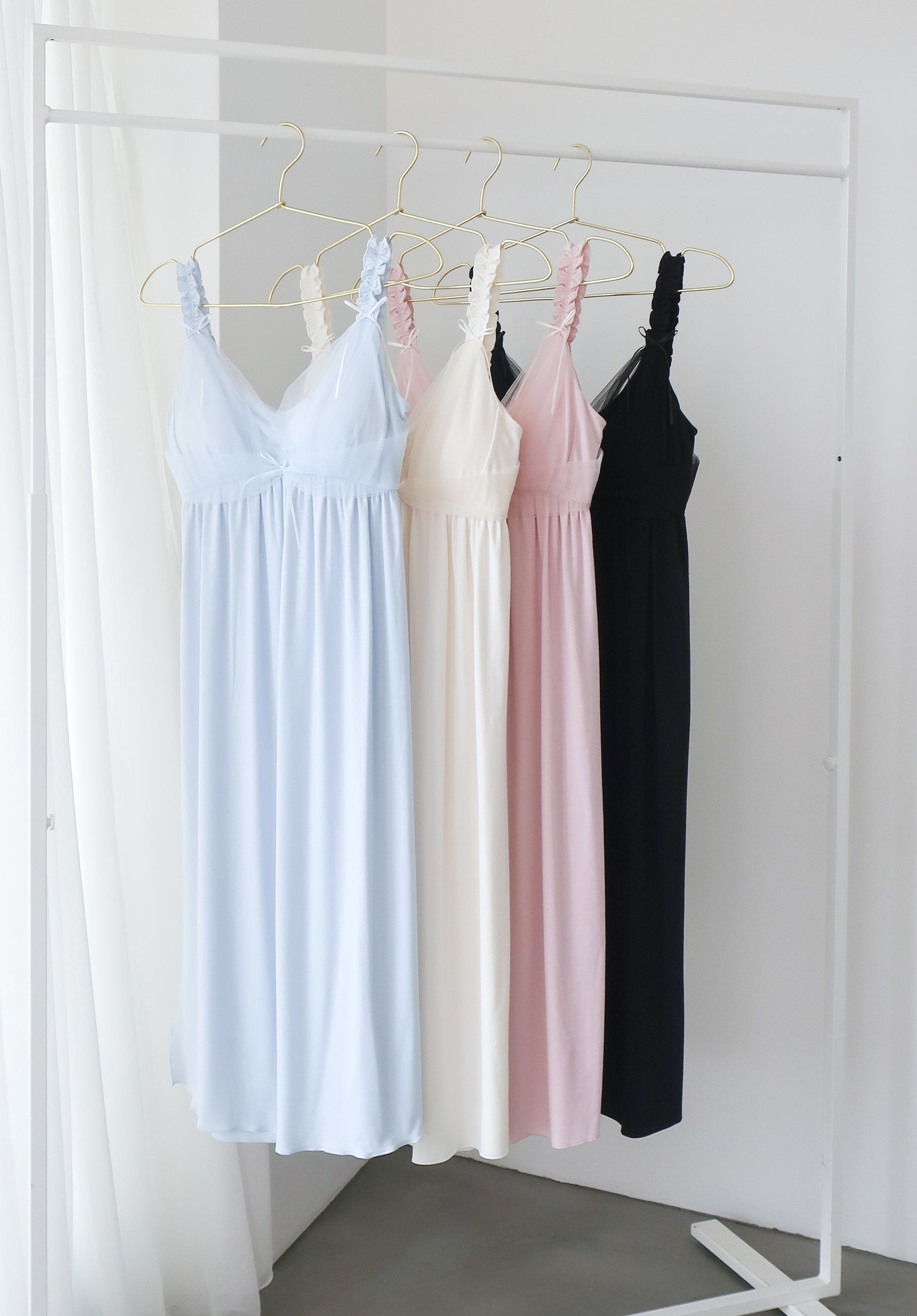 ギャザーを寄せた胸元のチュールが、透け感と立体感を演出。