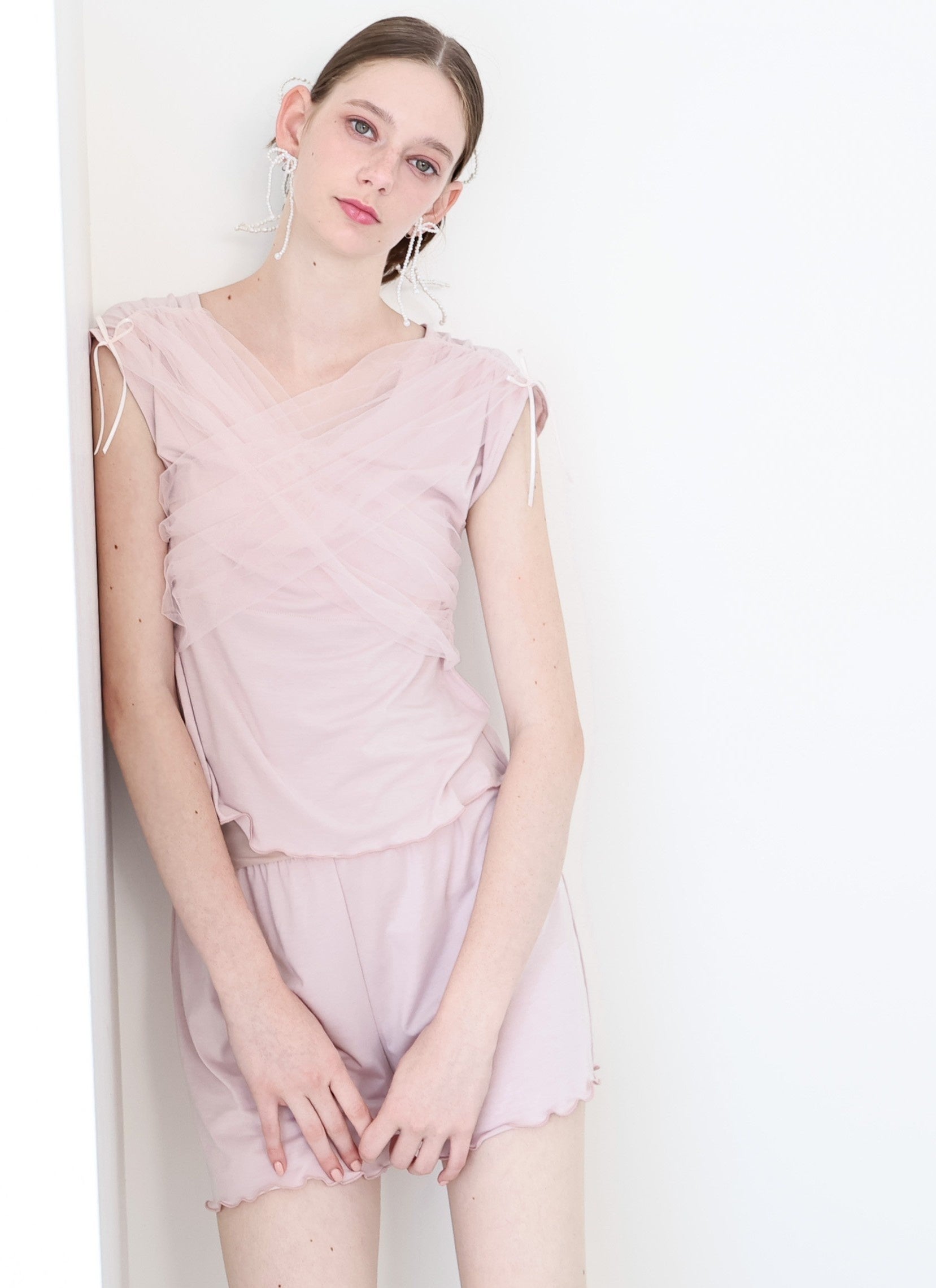 フレンチスリーブ×ショートパンツの軽やかなデザイン。肩を落としてオフショルダー風にも着用可能です。