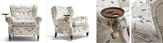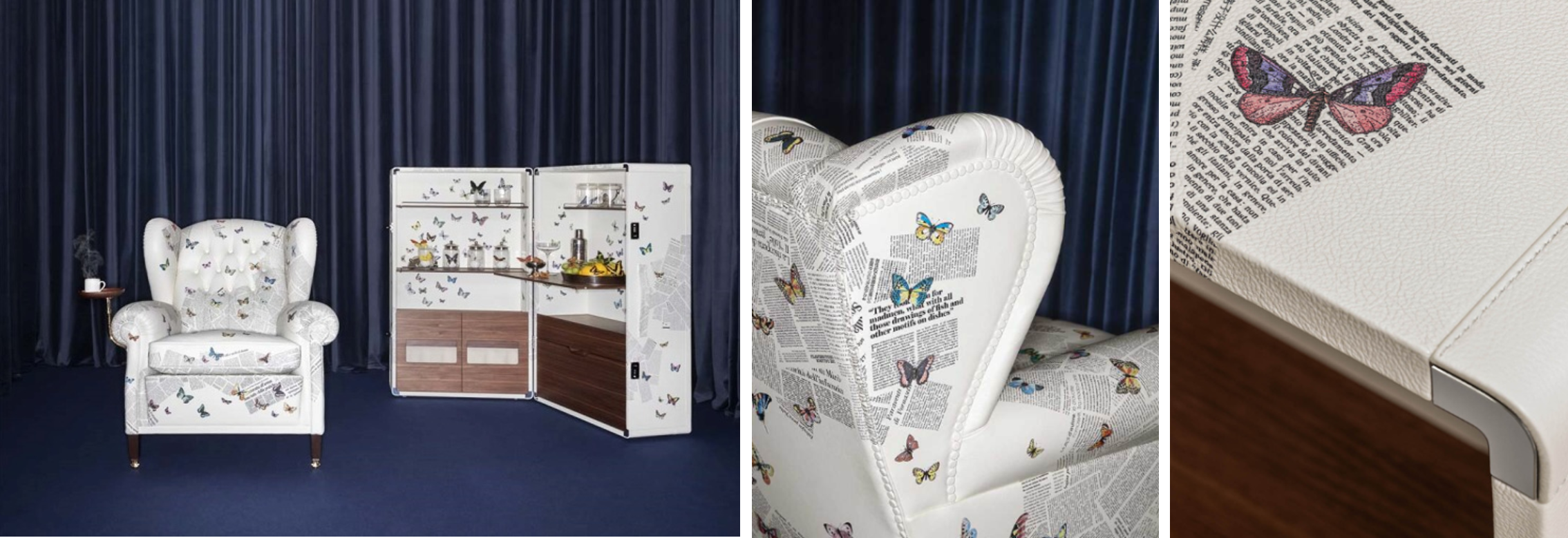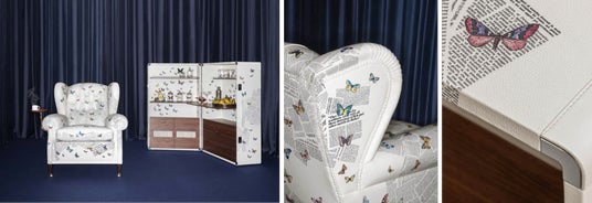 本コラボレーションでは、ポルトローナ・フラウの歴史を象徴するアームチェア「1919」とトランク型ドリンクキャビネット「Isidoro(イシドロ)」という2つのアイコニックなプロダクトを、フォルナセッティを象徴するモチーフとして知られる「Ultime Notizie(ウルティメ・ノティツィエ)」で再解釈しました。