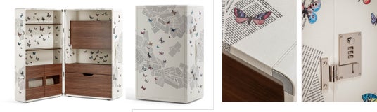 「Isidoro Ultime Notizie」は、フォルナセッティのモチーフ「Ultime Notizie」をプリントしたモデル。新聞の断片を思わせるグラフィックの中に蝶が舞う幻想的なデザインが広がり、独創的な美しさを備えたキャビネットとして、空間に特別な個性をもたらします。