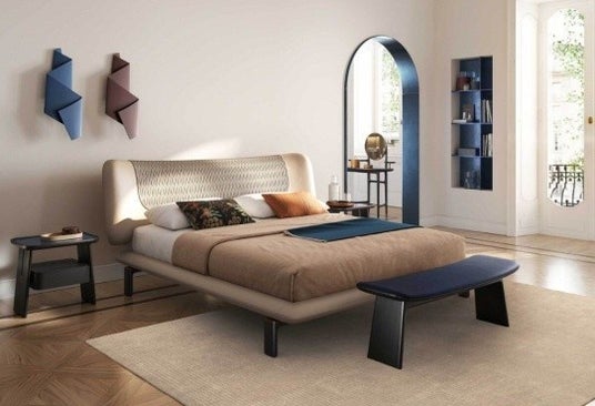 丸みを帯びたフォルムを特徴とするDUOコレクションのデザインを受け継いだベッドです。フレームから張り出すように設計されたパッド入りヘッドボードは、包み込むような印象を生み出し、取り外し可能なキルティングには立体感のあるマトラッセステッチが施されています。