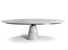楕円形の天板と円柱の脚という二つの要素で構成され、余計な装飾を排することで素材とフォルムそのものの美しさを際立たせています。繊細な大理石の天板と、力強い存在感を放つ円柱ベース。そのコントラストが空間に印象的な表情を生み出します。高品質な大理石の天板は一枚ごとに異なる模様を描き出し、流れるような表情がシンプルなフォルムに豊かさと気品を添えます。