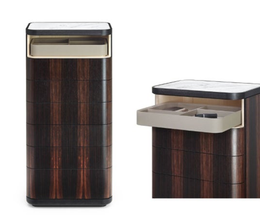 空間にエレガントで落ち着いた印象をもたらす収納家具。上質な素材感と丁寧な仕上げにより、洗練された存在感を生み出しています。引き出しは収納力と使いやすさを兼ね備え、寝室やリビングで活躍します。
