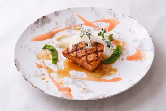 ・メカジキのグリル 紹興酒ソース 新玉ねぎのピューレ グレープフルーツのジュ
