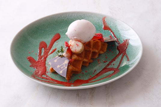 サクッと香ばしく焼き上げたクロッフルび、爽やかなライムクリームチーズをサンド。甘酸っぱいいちごと、いちごのピューレ、まろやかなストロベリーマスカルポーネアイスクリームが重なり合い、ほんのりスパイシーな黒胡椒バターがアクセントとなる、自由な遊び心あふれるデザートです。