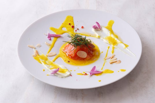 日本の春を象徴する「菊」の鮮やかなイエローのソースがアートフルに生きる一品。アトランティックサーモンの濃厚な旨みを、菊のソースの軽やかな酸味とハーブの香りがエレガントに引き立てます。
