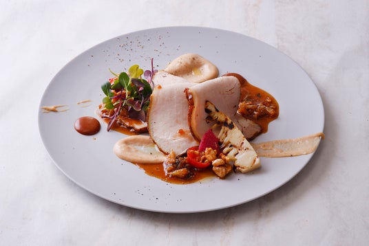 スパイシーにマリネし、しっとりとローストしたポークに、ライムジンジャーソースの酸味と辛みが旨味を引き立てます。コク深いクルミのピューレとほのかなキャラメルの甘みが重なり、味わいに奥行きをプラス。みずみずしいトマトと蕪のマリネが彩りを添える、エネルギッシュな一皿です。
