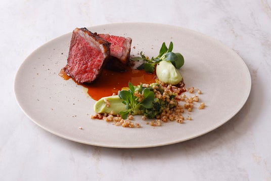 きめ細やかな肉質の国産牛のサーロインを香ばしくグリル。柑橘のほろ苦さを効かせたビガラードソースが、力強い旨みに洗練された味わいをもたらします。なめらかな空豆のピューレの甘みと、香り高い菜の花の焼きびたしが春の味覚を演出し、ハラペーニョヴィネグレットのアクセントとソバの実のフリットの軽快な食感をお楽しみいただけます。